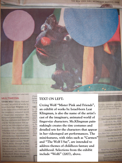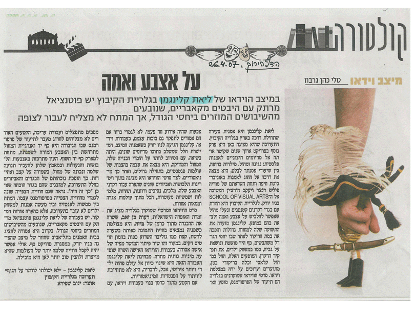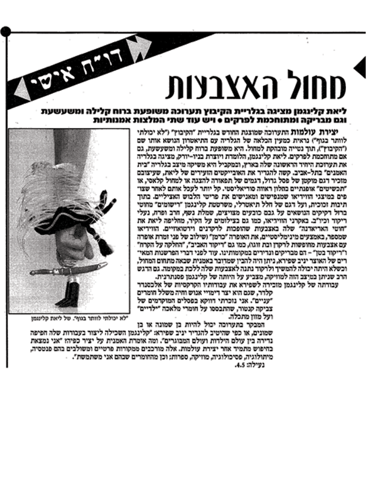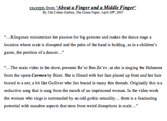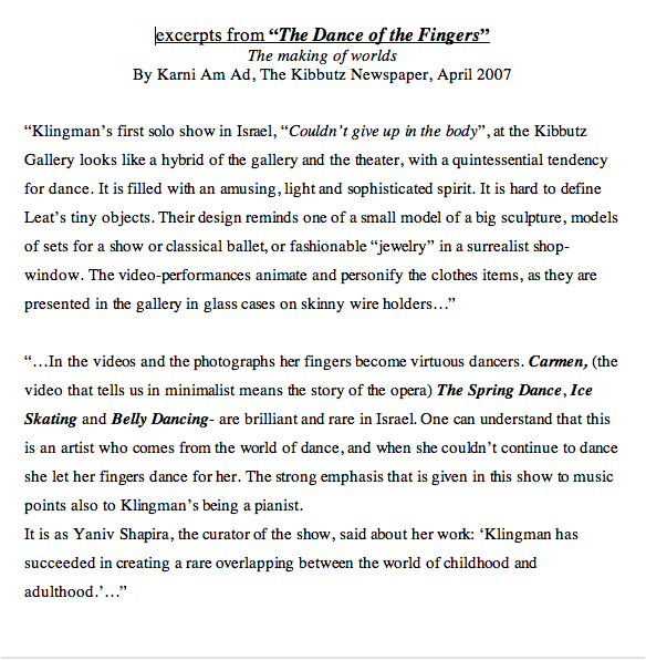 Bushwickbk.com, Moviehouse: Good Riddance, Bedford ‘Catwalk' by Anna D'Agrosa, September 16 th , 2008 The New York Sun, Calendar- Multimedia, ‘Crying Wolf' , March 5 th 2008 Time Out Tel-Aviv, num.232, Art Review “To Die from Laughter ” by Dana Shweppi, pg.91, April 12 th -19 th 2007, Israel The Green Page, Kibbutz National Newspaper, Art Review “ About Finger and Thumb ” by Tali Cohen-Garbuz, April 26 th 2007, Israel The Kibbutz Newspaper, Art Review “ The Dance of Fingers” by Karni Am-Ad, April 26 th 2007, Israel Yediot America, Pleased to Introduce Section by Michal Daniel, pg.7, April 5 th 2007, New York Zeek, A Jewish Journal of Thought and Culture, Online magazine, What Happens Next: The Comedy (or not) of the Situation , Robbie Grinras, February 2006 “ Dalit Gurevich & Leat Klingman”, Noa Morduch-Simonson, Terminal, A Review of 21 st Art, Winter , Num.26, pg.14-17 , 2005 Art Review, Meditating America - CoCA Annual Artists Exhibition , Regina Hackett, Seattle Post-Intelligencer, Washington, Seattle , Nov.2005 Catalog for Enrollment, Kalisher, Institute of Technological Art, Tel-Aviv, Israel , 2004The Fifth Year Solo Shows Catalog, Kalisher, Institute of Technological Art, Tel-Aviv, Israel , 2003 First Portrait, Catalog of Exhibition at the Tel-Aviv Museum of Art, Israel National Lottery Council for the Arts, Tel-Aviv, Israel , 2003 Lions for the children of Jerusalem Catalog, The New Jerusalem Foundation, Jerusalem , 2003 Mainz-City Newspaper, Review of Winners at competition- Kunst Inderstadt, Mainz, Germany , 2003 |